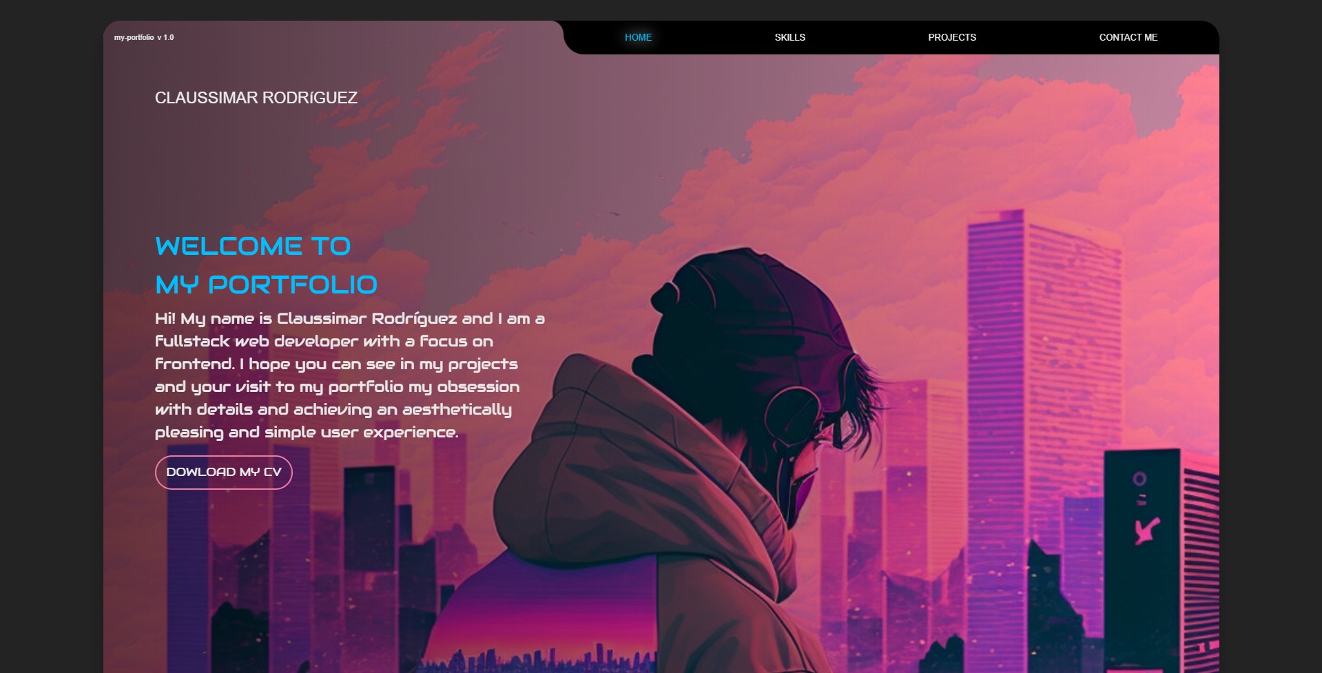 This portfolio is a project inspired by the synthwave aesthetic, which is a style based on electronic music and video games from the 80s and early 90s. It is mainly characterized by its retro-futuristic style, with bright and neon colors.